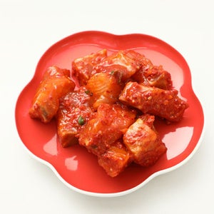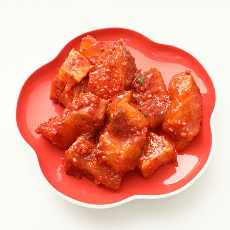 このサーモンを大胆にぶつ切りにし、特製のヤンニョムでくるみ、キムチにしました。辛いヤンニョムに、りんご、レモンの果汁がたっぷり入り、さわやかな甘味と辛さが際立っています。丸大豆しょうゆから作ったまろやかな醤油だれも入り、コクが加わっています。