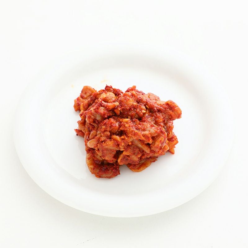 北海道産水タコを生でスライスし、オリーブ七味、果汁、生味噌コチジャン、ヤンニョムジャンで作る特製タレで和えた、グルメな方向けのチャンジャです