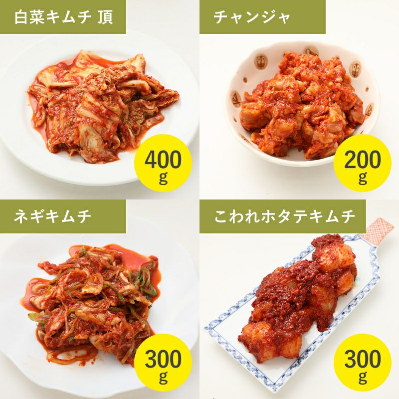まずはこのセット! 白菜キムチ頂、ホタテキムチ、チャンジャ、ねぎキムチの人気4品のお買い得セット初めての方向けセット