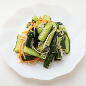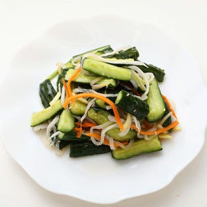 小切れにしたきゅうりに、ダイコン、にんじん、にら、りんご等をミックスして、ほんのわずかスパイスも加えて、サラダのようなキムチに仕上げました。
