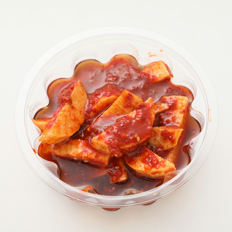剥きたての国産山芋を食べやすいサイズにカットして、新作のタレ(ヤンニョム)に漬けました。